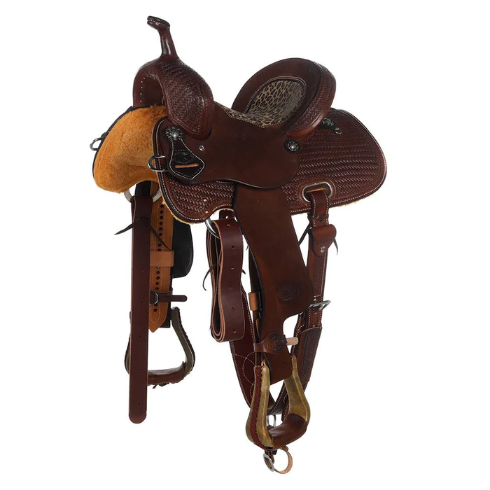 This Competitor Series Barrel Racer has a 5 year warranty on the rawhide covered wood tree, antique floral conchos, rawhide stirrups, 1/2 breed, front in skirt rigging, leopard inlaid seat, a cut down skirt and 90/10 wool blend lining. The seat pocket is constructed to help hold the rider in place and offer better balance effectively giving the rider every advantage.